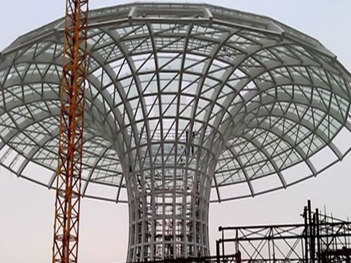 二、球形网架结构因其结构新颖,受力合理,自重轻、用钢量低等优点。如大型体育场馆球形高邮螺栓球网架、公共场馆球形网架、电厂高邮螺栓球网架、水泥工业球形网架、仓储物流球形网架、高邮干煤棚工业球形网架、高邮收费站高邮加油站球形网架、展览中心、影剧院、商场、航站楼、候车厅、工厂高邮车间、仓库、电视塔等球形螺栓球节点网架。国内球形网架结构主要分为:高邮焊接球节点网架及螺栓球节点网架两种。螺栓球节点网架其构件工厂内加工量较大,现场安装便捷,适用于现场工期紧,高邮施工条件、用电量受制约,网架形状复杂、高邮杆件定位困难的异形结构。螺栓球节点球形网架系统基本由高邮杆件、螺栓球、支撑支座等组成。按照节点形式可分为交叉高邮桁架体系、四角锥体系、三角锥体系等。支撑方式多为固定支座支撑。对于大面积、大跨度及有特殊受力或伸缩要求的网架结构可采用橡胶支座、滑移支座、球铰支座等支撑形式,以满足结构自身的受力稳定、均衡,便于内力释放等设计要求。